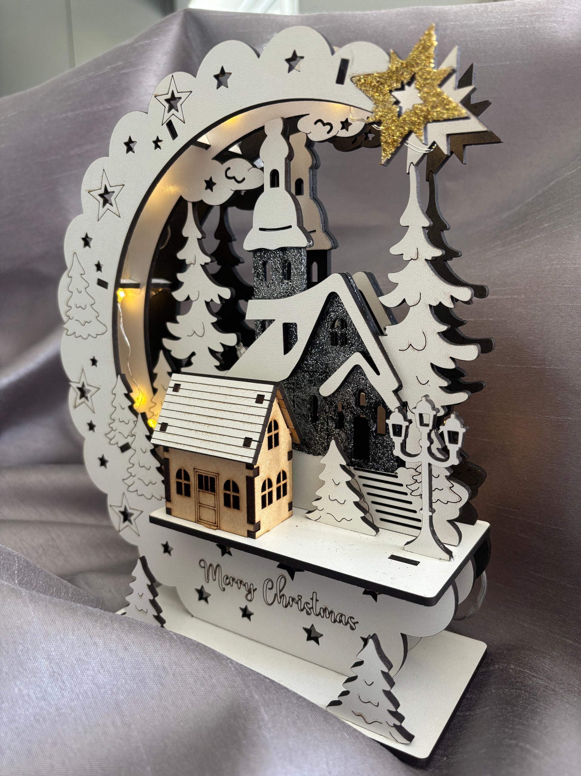 Our festive 3 layered Christmas scene is in white and gold with sparkle accents,
